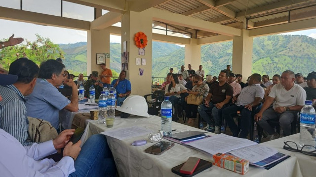 Participantes de la mesa de diálogo en la casa de la cultura del municipio de Marmato (Caldas), en el sector de El Llano, donde se pactaron los acuerdos este sábad