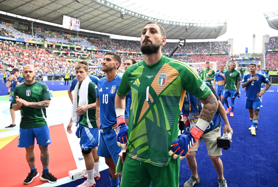 Foto | EFE | LA PATRIA El abatido portero italiano Gianluigi Donnarumma (1) y sus compañeros miran a los aficionados después de perder el partido de fútbol de octavos de final de la Eurocopa 2024 entre Suiza e Italia, en Berlín (Alemania).