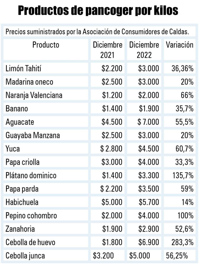 La Asociación de Consumidores de Caldas merca cada mes una lista cercana a los 25 productos de pancoger, incluyendo frutas y verduras. Al comparar los precios registrados en diciembre del 2021 con los del mismo mes en el 2022 se aprecian aumentos entre el 14% y el 283%.