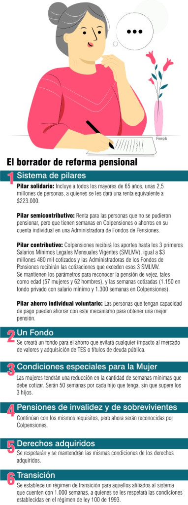 Otro aspecto positivo entre los 89 artículos que se contemplan del borrador de reforma es el pilar solidario, con el que se busca entregar $223 mil a los mayores de 65 años que no lograron su pensión, por lo que inclruirán unas 2,5 millones personas, con un aporte que según el Ministerio de Trabajo será tres veces superior al subsidio que actualmente otorga el programa Colombia Mayor. Esto, aunque inicialmente la propuesta del presidente Petro era de $500 mil.