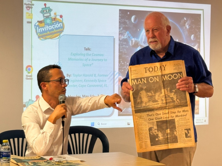 Taylor Harol, exingeniero del Centro Espacial Jhon F. Kennedy y participe del lanzamiento del Apolo 11, estuvo en el Sena Caldas orientado una charla a los aprendices.