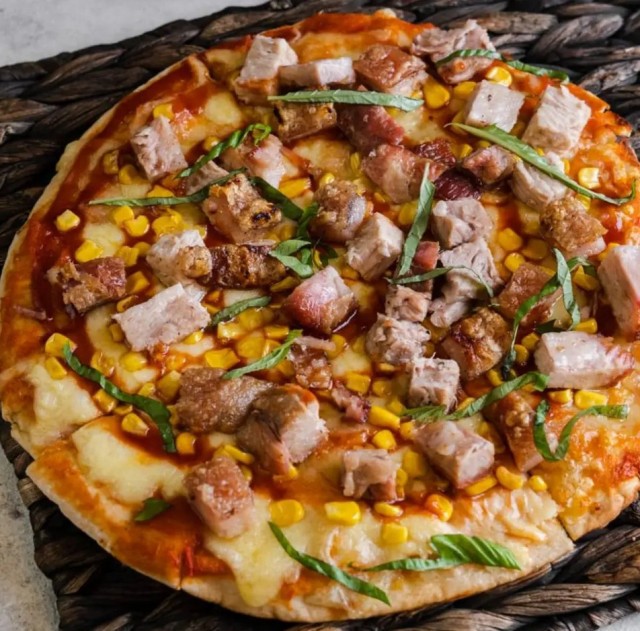 Descripción: Pizza Di Porko’s elaborada con ingredientes de la más alta calidad. Contiene una base de pan árabe crocante, pasta de tomate artesanal de la casa, BBQ de guayaba, queso mozzarella, maíz tierno al wok, albahaca fresca y chicharrón horneado y crujiente.