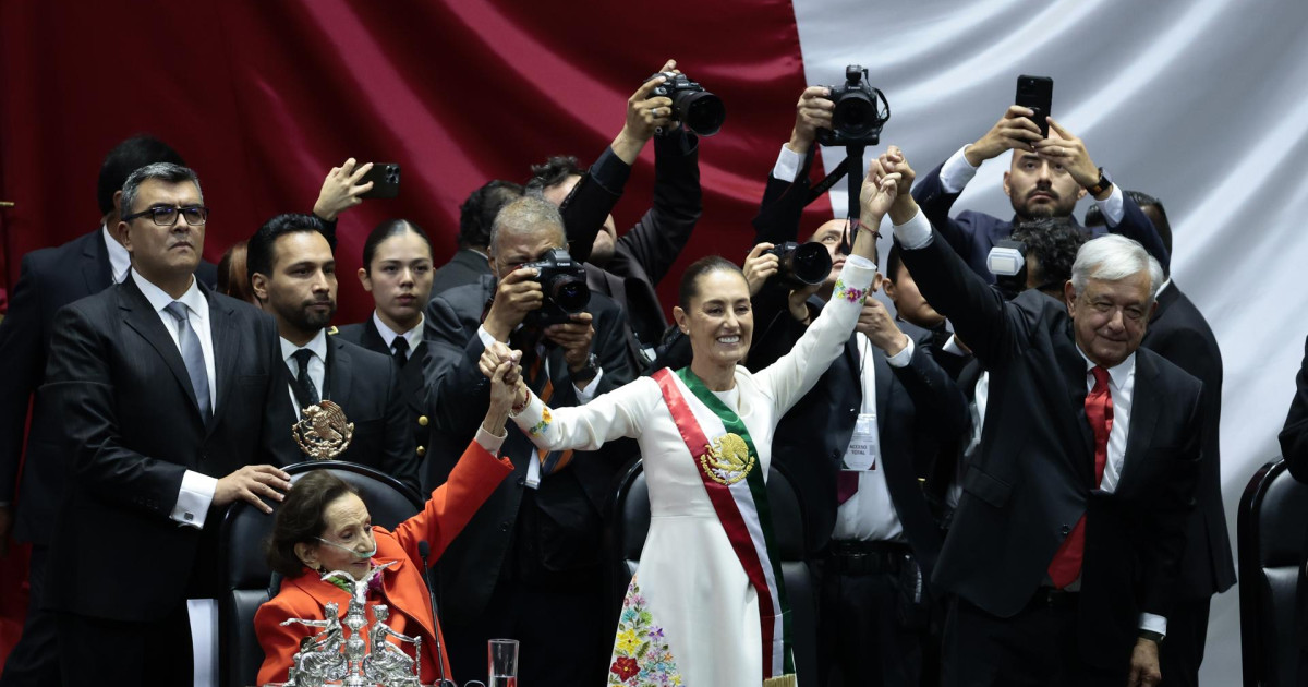 El mandatario saliente, Andrés Manuel López Obrador (2018-2024), entregó la banda presidencial a la presidenta de la Cámara de Diputados, Ifigenia Martínez, quien colocó la prenda tricolor a Sheinbaum, la primera mujer que gobernará el país tras más de sus 200 años de ser república.