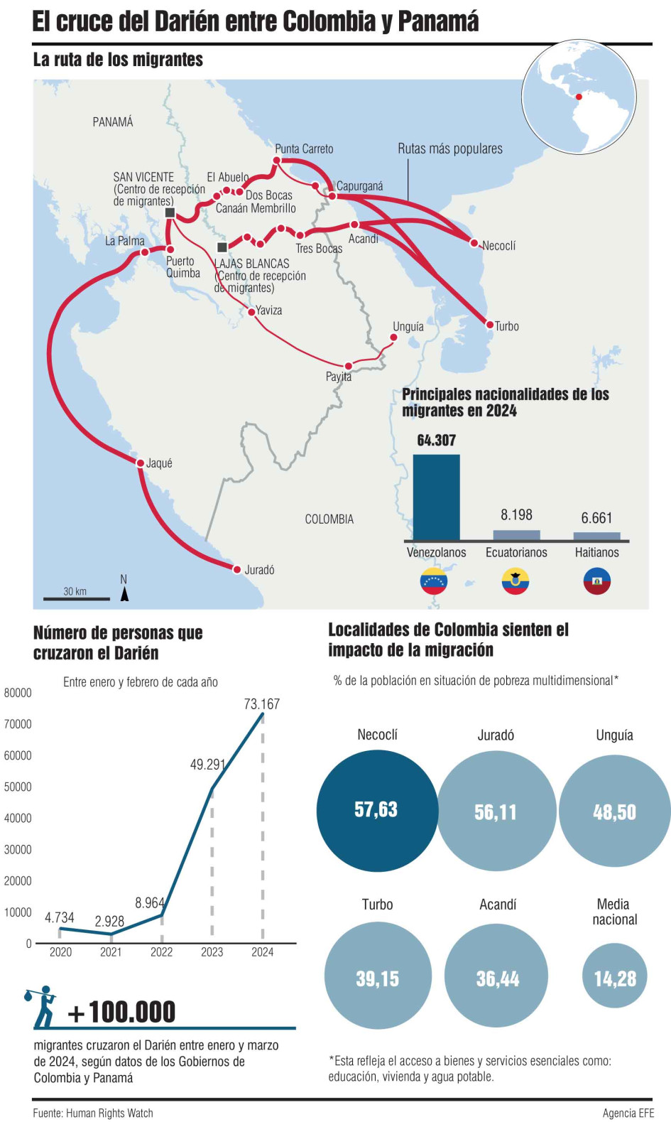 La organización Human Rights Watch (HRW) acusó el pasado miércoles a las autoridades de Colombia y Panamá de no estar “protegiendo ni asistiendo” a los miles de migrantes que cruzan el Darién, una cifra que superó los 500.000 en 2023, un máximo histórico, y de no investigar los abusos, incluidos los asaltos sexuales, de que son víctimas.