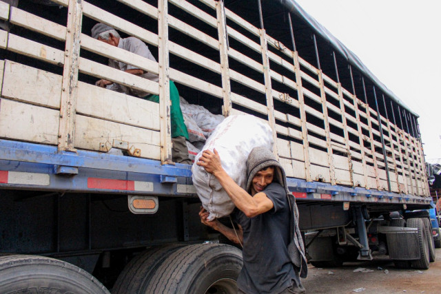 Juan Pablo Alzate carga un bulto de papa de 50 kilogramos. Dice que en un día puede descargar unos 7 u 8 camiones al día.