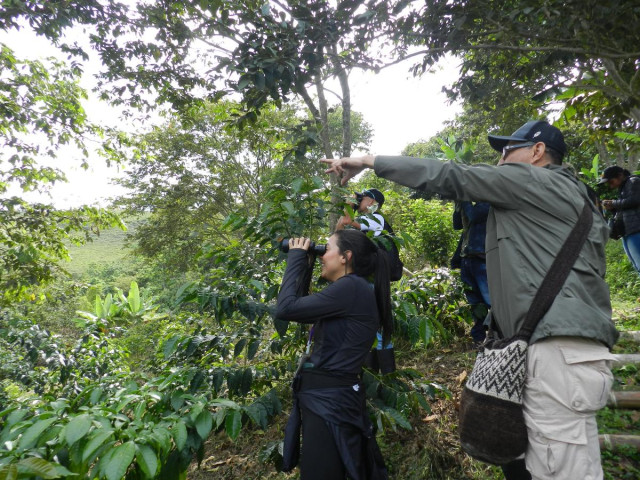 La manizaleña Ana Giraldo avistó aves por primera vez el sábado en la salida a Tío Conejo, en la vía Neira, durante el 11º Congreso de Aviturismo. El caucano William Efraín Abella Herrera, con 23 años de experiencia, le explicó cómo observarlas.