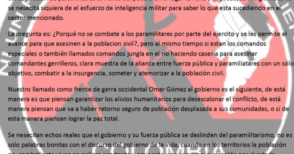 Comunidades del departamento del Chocó alertaron sobre el "grave riesgo" que enfrentan por la incursión de grupos ilegales y enfrentamientos entre el Clan del Golfo y el Eln, así como por un "paro armado", a pesar del anuncio de "alivios humanitarios" en esa zona hecho el lunes por esa guerrilla y el Gobierno colombiano en Caracas.