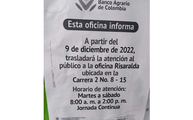 Supimos Que Supimos que: Trasladaron la oficina del Banco Agrario en Arauca (Palestina) 15 Dic, 2022 /sites/default/files/noticia/2022-12/banco.jpg