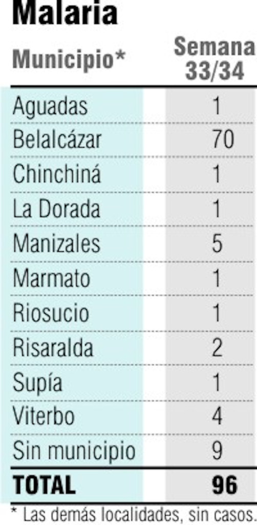 Patiño agregó: "Manizales (con cinco casos de malaria) tiene una zona, que se llama el Kilómetro 41, que es endémica para dengue y malaria. Pero lo que queda en la jurisdicción de Neira, específicamente en la vereda Shangay, está aportando tres de esos cinco. Ya se hizo la investigación de campo".