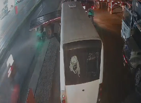Luego se ve el arribo de la moto en la que iban Juan Camilo y una adolescente. La moto choca contra la parte trasera del vehículo pesado.