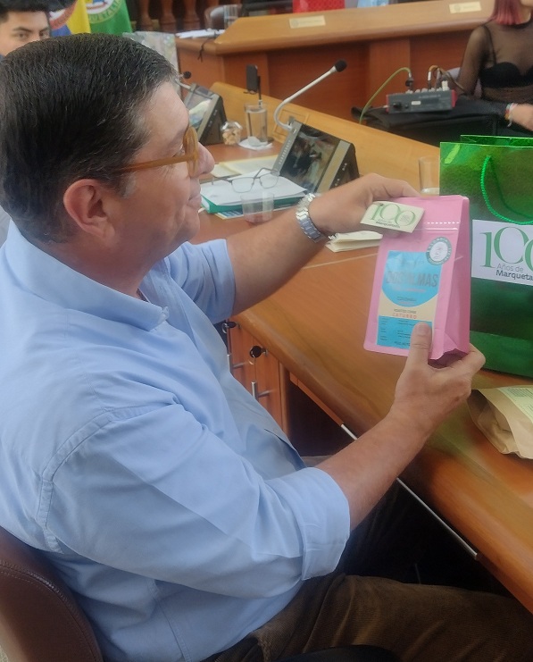 Manizales. Contento se le vio al diputado Luis Roberto Rivas, del Partido Conservador, destapando los obsequios que llevó una comitiva de Marquetalia, con productos de ese municipio del oriente de Caldas, y luego de que la Asamblea aprobó la ordenanza 001 con la que le rindieron honores a Marquetalia para la celebración de sus 100 años de fundación, que se conmemorará el próximo 26 de abril.