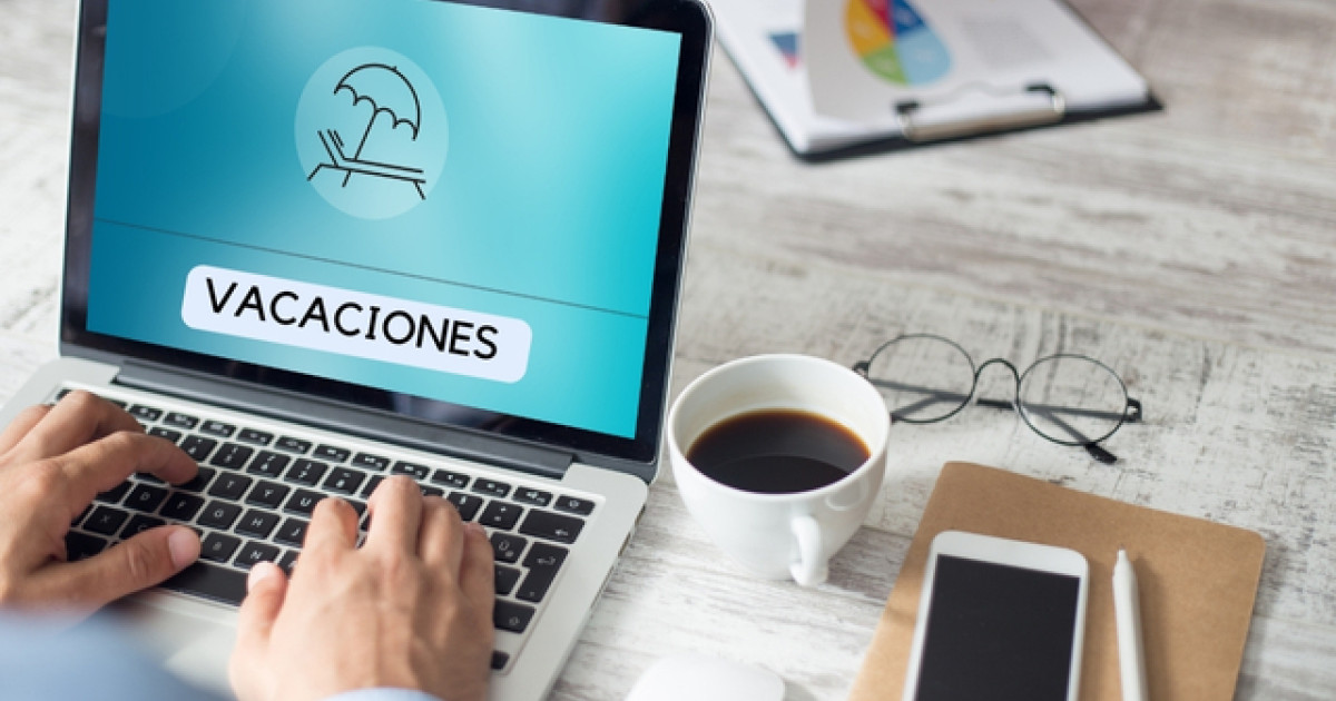 Persona teclea en un computador que dice "VACACIONES". Al lado hay un café, un celular y una carpeta.